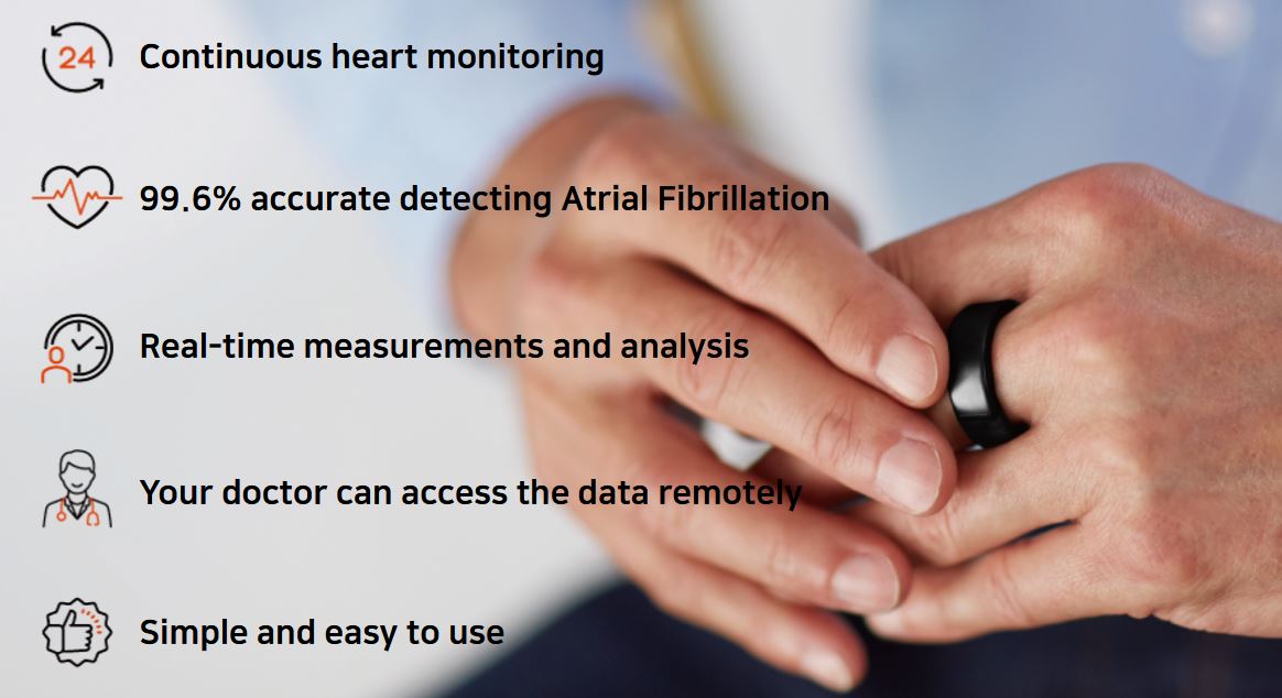 Устройство измеряет нерегулярный пульс пациентов с фибрилляцией предсердий с помощью оптических датчиков, причем оно может автоматически измерять сигналы непрерывно. Для этого достаточно просто надеть его на палец. Кстати, компания выпускает такие кольца в различных размерах, что позволяет его использовать разным людям.