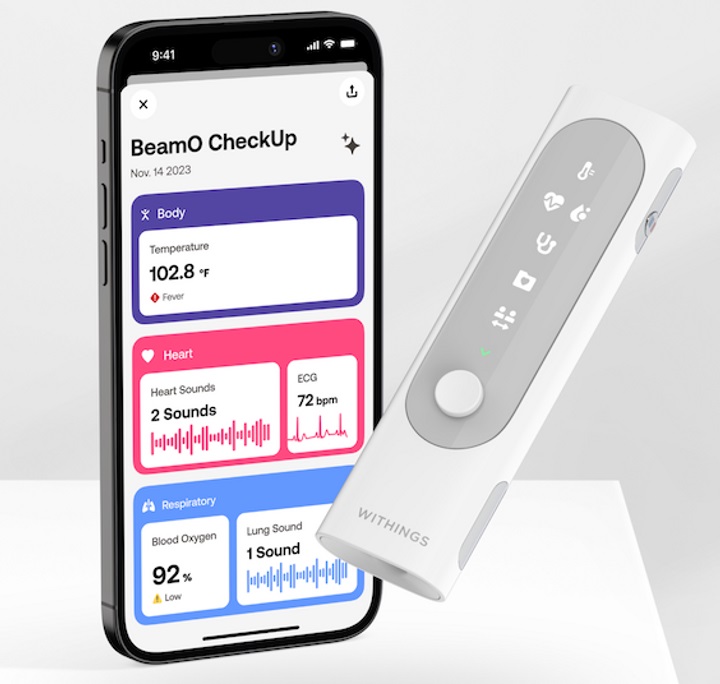 На выставке CES 2024 компания Withings представила BeamO - устройство для оценки состояния здоровья класса "4 в 1". Этот "мультископ", сочетающий в себе сенсоры ЭКГ, оксиметра, стетоскопа и термометра, позволяет следить за важнейшими показателями здоровья, которые традиционно измеряются на приеме у врача.
