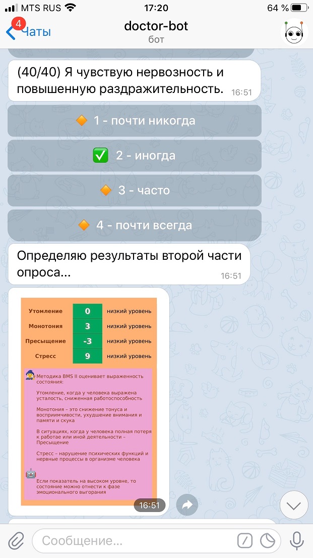 Тестирование проходит в формате ответов на вопросы чат-бота в мессенджере. Методика разработана экспертной командой во главе с практикующим психологом, профессором, доктором психологических наук И.М. Слободчиковым. В основу легли следующие инструменты: шкала PSM 25 (Лемура Тесье Филлиона), предназначенная для измерения структуры переживания стресса, опросник «Утомление - монотония – пресыщение - стресс», представляющий собой адаптированную А. Б. Леоновой версию немецкого опросника BMS II, и комплексная методика оценки уровней эмоционального выгорания и анализа системы факторов, влияющих на формирование данного состояния.
