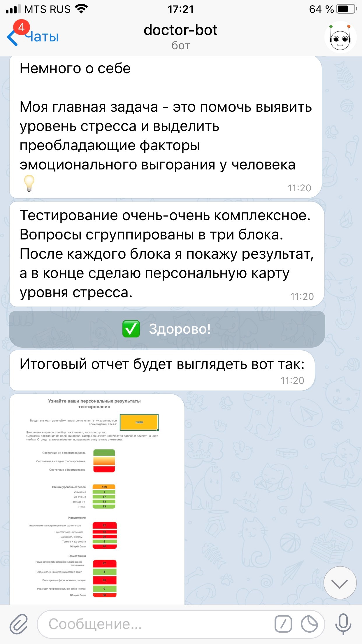 Мы предлагаем чат-бота как сервис для наших корпоративных клиентов в рамках комплексной программы медицинского обслуживания, объединяющей очные приемы и телемедицину, которая может также включать психологическую помощь для персонала.