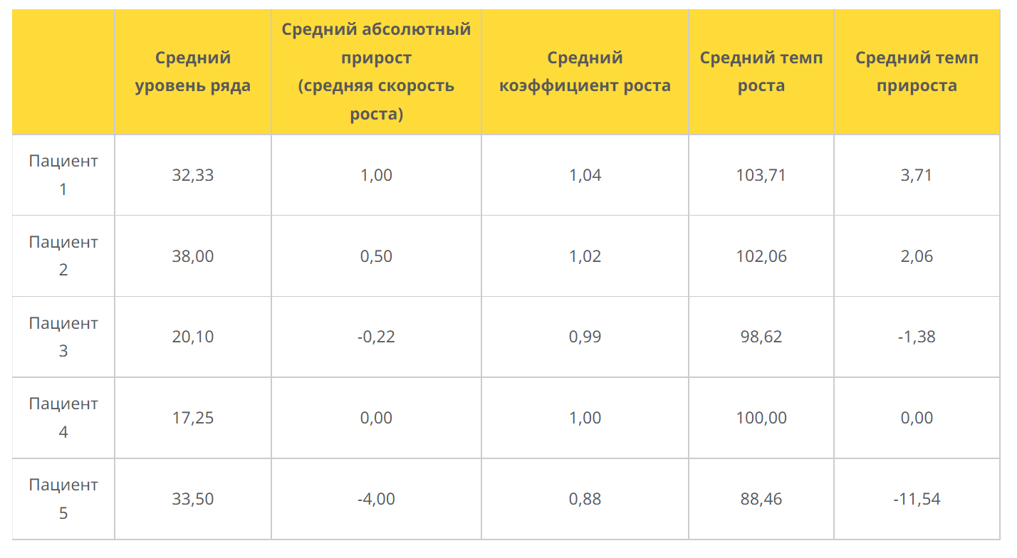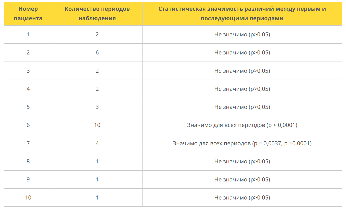 Относительно исходного числа измерений в первом (базовом) периоде только у одного пациента наблюдается относительно устойчивое поддержание уровня приверженности. Вместе с тем, преимущественно отрицательные значения цепных показателей свидетельствуют о неуклонном снижении числа измерений. С одной стороны, это может говорить об улучшении общего состояния пациентов и снижении потребности в столь частых измерениях. С другой стороны, снижение приверженности создает риски для программы дистанционного наблюдения в целом и явно требует специальных мероприятий по вовлечению пациентов. В любом случае эти процессы носят общий характер и не связаны с технологическим качеством программно-аппаратного комплекса.