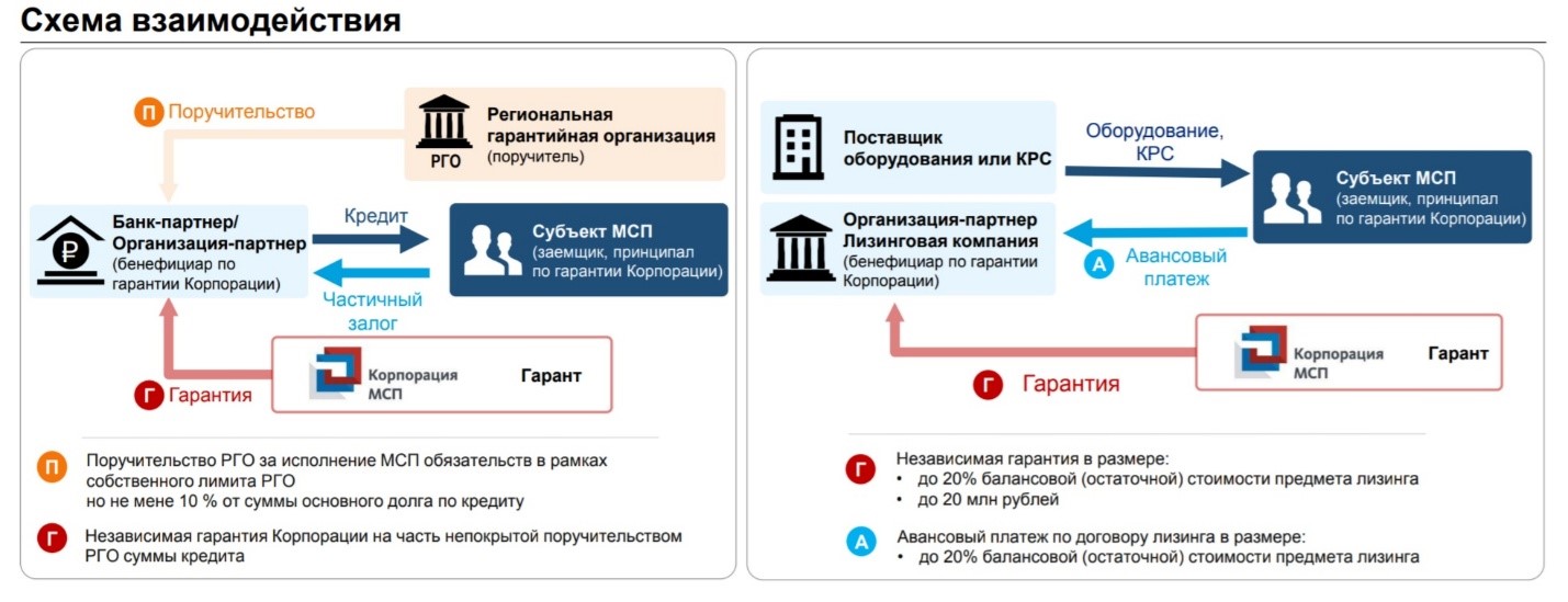 Акционерное общество «Федеральная корпорация по развитию малого и среднего предпринимательства» занимается кредитно-гарантийной поддержкой стартап-проектов, находящихся на высокой стадии реализации. Корпорация предлагает потенциальным партнерам поддержку в виде долгового финансирования от партнеров Корпорации (частные банки и государственные фонды) обеспеченную прямой гарантией Корпорации для стартапов. Подобный механизм финансирования может быть эффективной альтернативой привлекаемым прямым инвестициям в капитал компании взамен на долю в ней, что позволяет сохранить первоначальную структуру собственности компании.