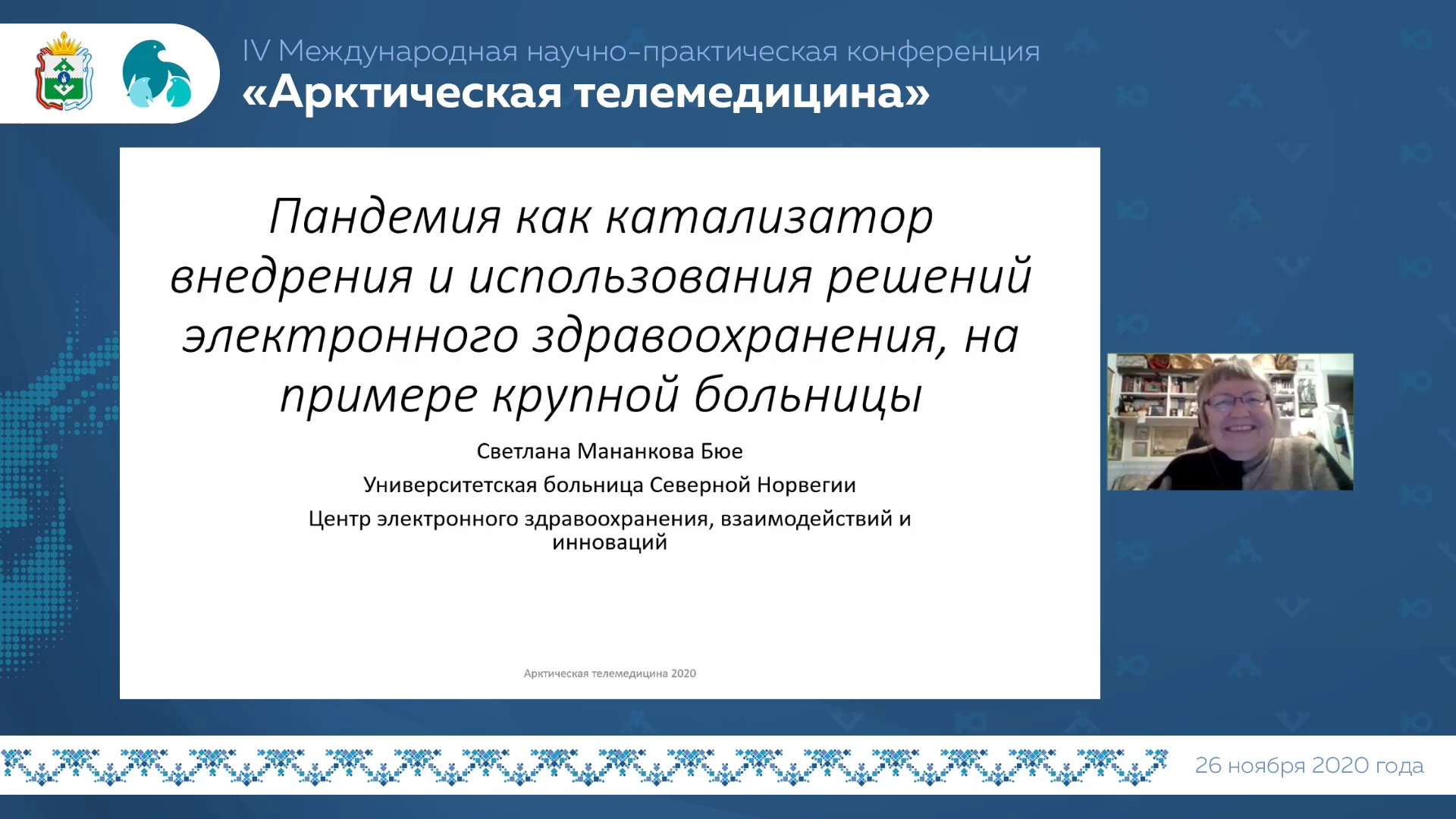 26 ноября 2020 года в онлайн формате состоялась IV Международная научно-практическая конференция «Арктическая телемедицина». Целью конференции было обсуждение вопросов использования информационных технологий для обеспечения доступности и качества медицинской помощи в условиях Крайнего Севера (Арктической зоны).