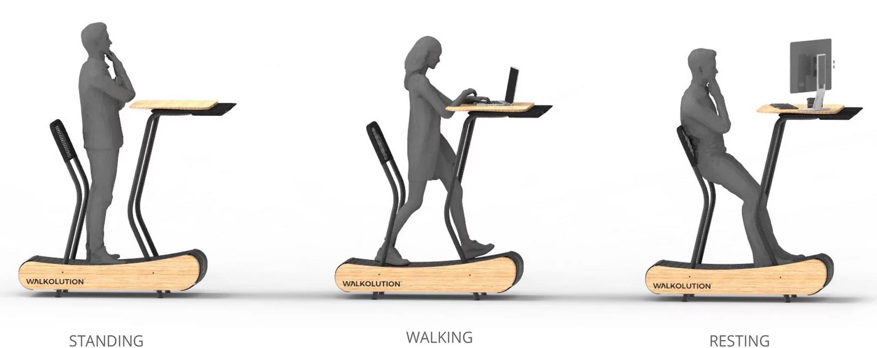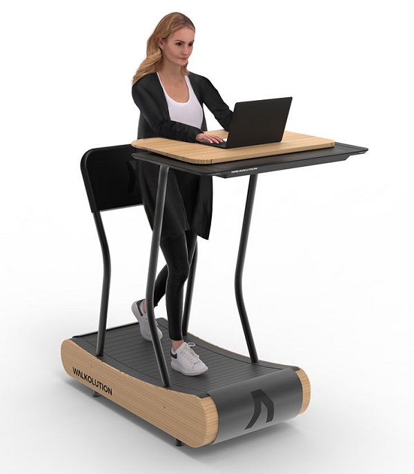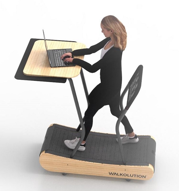 Устройство компании Walklution обещает избавить нас от "простоя" при работе. Компания разработала научно обоснованную концепцию рабочего места для того, чтобы активная работа могла осуществляться приемлемым для здоровья образом. Система позволяет концентрироваться на своей работе и в то же время медленно ходить по безмоторной беговой дорожке за регулируемым по высоте столом, не думая о своих потерявших форму и ноющих ягодицах. Особенностью запатентованной системы является то, что пользователь может интуитивно регулировать скорость с каждым шагом, не используя каких-либо кнопок и электронных устройств. Кроме того, опирающаяся опора и модуль сиденья позволяют менять положение тела. Еще одним решающим фактором для использования в условиях офиса является то, что система работает абсолютно бесшумно, так как ей не нужен мотор и работает она за счет использования массы тела и силы тяжести. Это означает, что беговая дорожка не беспокоит и не отвлекает ни пользователя, ни работающих рядом с ним людей. Компактное активное рабочее место мобильно, не требует больше места, чем обычный стол со стулом и органично вписывается в среду любого офиса своим элегантным и современным дизайном.
