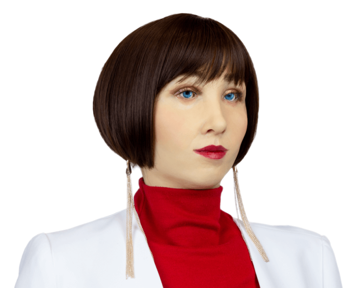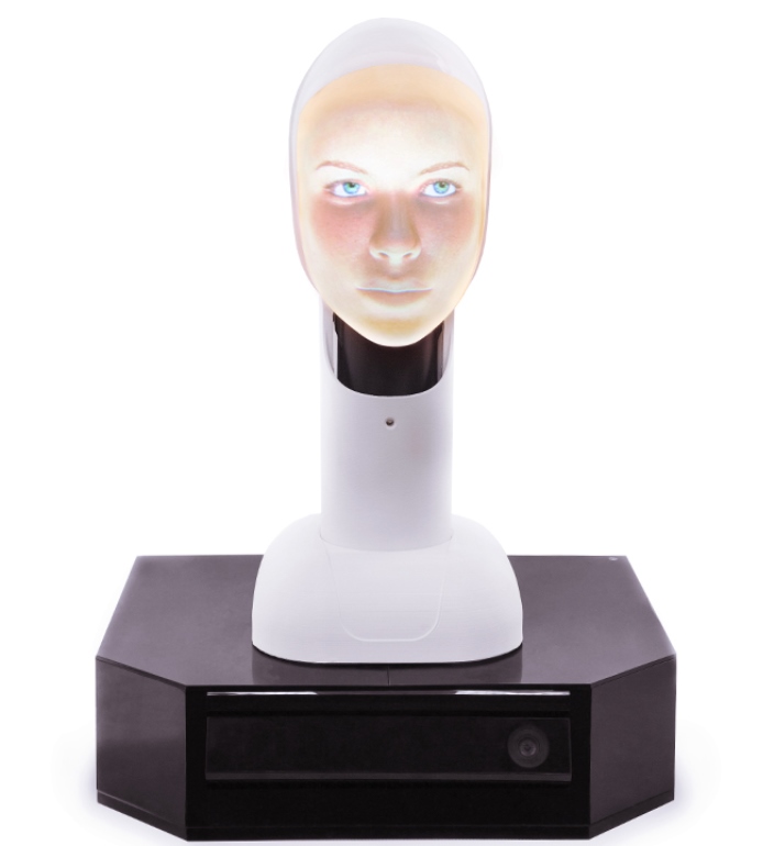 - Проекционный робот. Это социальный антропоморфный робот, созданный для общения. Лицо робота полностью анимировано, что позволяет использовать разные лица на одном устройстве и отображать мимику без ограничений. Робот может вести диалог и одновременно использовать жесты (кивок, поворот головы и т.п.) и мимику для невербального общения, поддерживать зрительный контакт с собеседником и демонстрировать эмоции. Все эти функции призваны сделать общение между роботом и человеком более комфортным.