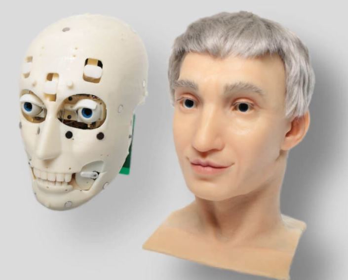 - Антропоморфные роботы с силиконовой кожей, изготовленной таким образом, что позволяет детально передать фактуру и особенности кожи, делает лицо и мимику робота реалистичными. Встроенные в таких роботов устройства и приводы обеспечивают мимику и движение мышц лица, что делает такие устройства пугающе похожими на людей, правда слегка заторможенных. Некоторые модели таких роботов способны реагировать на эмоции живых собеседников, поддерживать диалог, следить за передвижением человека или за его лицом.
