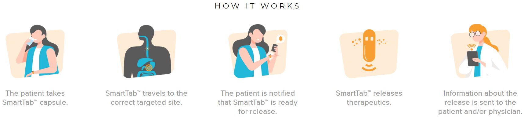 Капсула SmartTab, состоящая из умной полимерной оболочки, содержит сенсор, который постоянно контролирует ее местоположение и окружающую среду. Капсула отправляет эти данные на платформу SmartTab, доступ к которой можно получить со смартфона или компьютера. При этом капсула позволяет потребителям точно знать, где находится капсула, когда они решают выпустить ее содержимое. Как только SmartTab выпускает лекарство внутри нашего организма, пациент и врач получают текстовое сообщение с уведомлением об этом, причем записи сохраняются в порядке по времени, и никакое лекарство не может быть неправильно использовано или забыто.