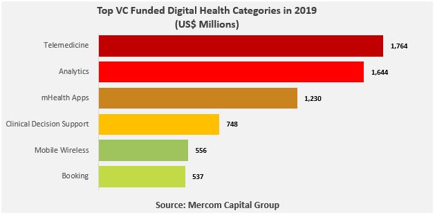 После трех лет роста подряд количество венчурных сделок и объем инвестиций для компаний, работающих в сфере цифрового здравоохранения, в 2019 году снизились. Правда, после длительного периода "засухи" было проведено четыре IPO в США, но пока их результаты были неудовлетворительными. Активность в сфере слияний и поглощений также снизилась в 2019 году. Крупными победителями прошедшего года стали телемедицинские компании, которым увеличили финансирование на 55% по сравнению с аналогичным периодом прошлого года, при этом компании, разрабатывающие цифровые медицинские продукты, которые работали на основе искусственного интеллекта, получили более 2 миллиардов долларов США.