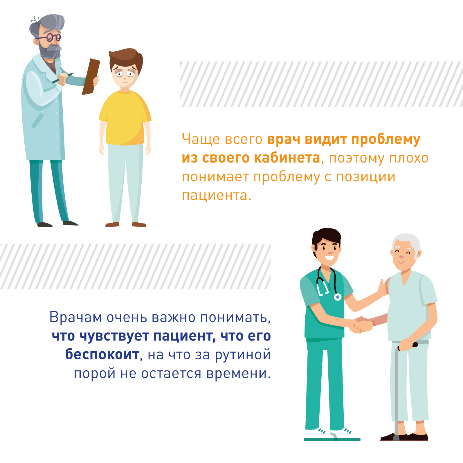 Чаще всего врач видит проблему из своего кабинета в поликлинике, с обхода палат в стационаре, с операционной, реже - с вызова к пациенту на дом, где пациент находится в привычной для него обстановке. Поэтому врач плохо понимает проблему с позиции пациента.