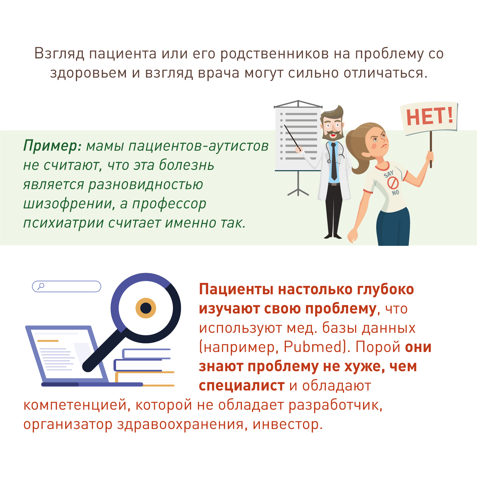 Пациенты иногда настолько глубоко изучают свою проблему, что для этого даже используют такие медицинские базы данных, как, например, Pubmed. Мне кажется, что пациенты с сахарным диабетом порой знают эндокринологию не хуже, чем эндокринолог из ЦРБ (не обижайтесь коллеги). Пациенты обладают компетенцией, которой не обладает врач, разработчик, организатор здравоохранения, инвестор.