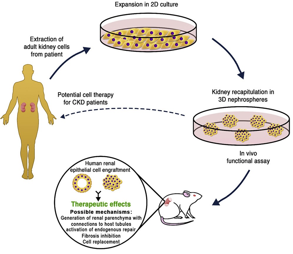 Изъятие поврежденных тканей из отказавших почек и аутотрансплантация прогениторных стволовых клеток, которые затем превращаются в здоровые ткани почки, теоретически могут отсрочить потребность в диализе.