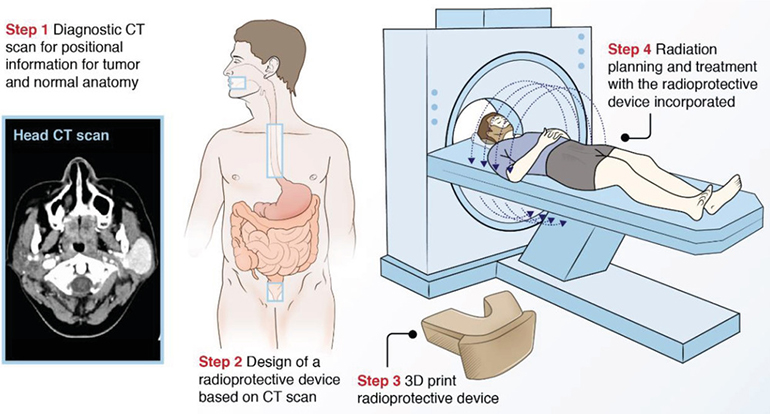 Американские ученые из больницы Brigham and Women и Массачусетского технологического института разработали защиту, изготовляемую при помощи 3D-принтера для предохранения желудочно-кишечного тракта от побочных эффектов радиотерапии. С помощью компьютерной томографии эти устройства могут быть напечатаны с учетом анатомии каждого пациента. Материалы, из которых они изготовлены, содержат элементы с высоким атомным номером, которые помогают защитить ткани от гамма- и рентгеновского излучения.