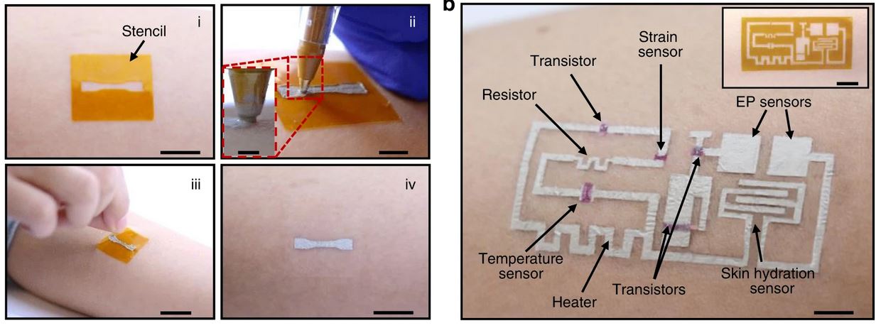 В настоящее время команда американских ученых из Хьюстонского университета разработала способ простого нанесения электронных схем, включая различные виды датчиков, непосредственно на кожу. Используя такой подход, ученые создали полнофункциональные сенсорные системы, которые могут с большой точностью и небольшим количеством артефактов измерять такие вещи, как увлажнение кожи, электрофизиологические сигналы и температуру тела. Другие сенсоры все еще нуждаются в разработке с использованием этой методики, но после их проектирования должен быть создан простой шаблон, по которому пользователь сможет создавать новые сенсоры и устройства.