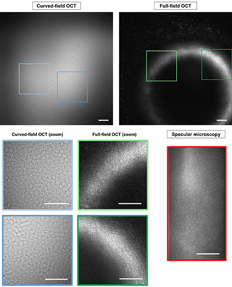 Оптическая когерентная томография (ОКТ) является методом визуализации, регулярно используемым офтальмологами для просмотра нескольких слоев роговицы и подсчета нервов и клеток внутри. Она важна для диагностики различных состояний глаза, а также при подготовке к операции по удалению катаракты. Проблема в том, что, как знает каждый, кто проводил макросъемку, очень трудно получить четкое изображение большого участка изогнутой поверхности, такой как глаз. Сейчас команда французских ученых разработала новую технологию ОКТ-визуализации, которая позволяет получать четкие изображения высокого разрешения значительных участков роговицы.