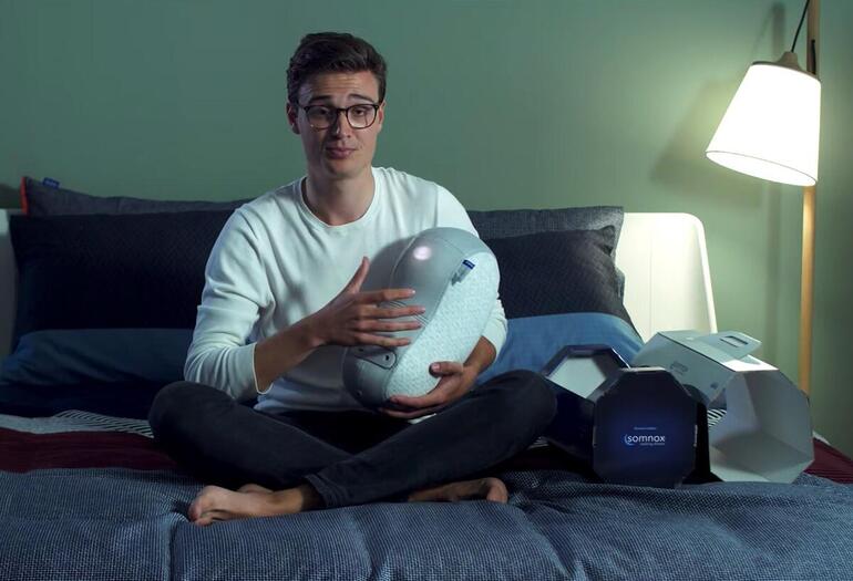 Эта небольшая, продолговатая и мягкая подушка помогает пользователю настроить медленный и регулярный ритм дыхания, позволяющий ему постепенно успокоиться и заснуть. Этот продукт разработан на базе исследований, которые доказали, что спокойное дыхание влияет на деятельность миндалевидного тела в мозге, играющего важную роль в эмоциональном состоянии человека. Датчики в роботе Somnox отслеживают частоту дыхания пользователя, а затем эта подушка затем либо синхронизирует свои движения с этой скоростью или устанавливает более медленную скорость для поощрения релаксации. Робот также включает успокаивающие звуки природы и белый шум. Компания также предлагает использовать робота в течение дня для медитации или сеансов релаксации.