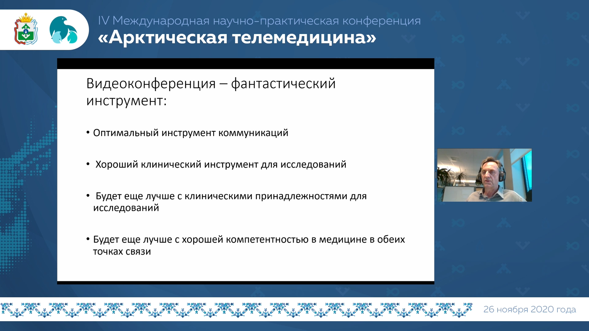 26 ноября 2020 года в онлайн формате состоялась IV Международная научно-практическая конференция «Арктическая телемедицина». Целью конференции было обсуждение вопросов использования информационных технологий для обеспечения доступности и качества медицинской помощи в условиях Крайнего Севера (Арктической зоны).