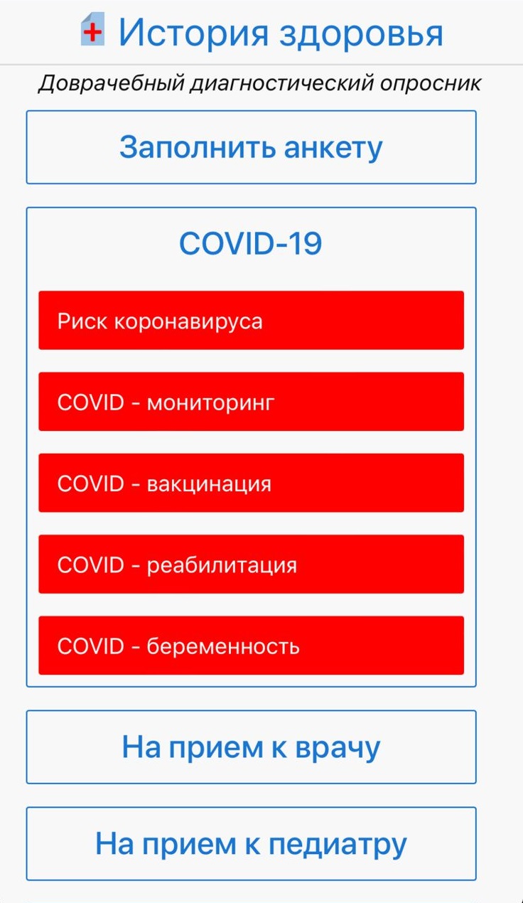 В рамках цифровой платформы «История здоровья» были разработаны приложения, образующие комплексное организационно-техническое решение для выявления заболевших («Риск коронавируса»), защиты коллектива от заражения («Ковид-безопасность»), удаленного наблюдения и управления лечением («COVID-мониторинг»), контроля вакцинации («COVID-вакцинация»), реабилитации после заболевания («COVID-реабилитация») и наблюдения за беременными («COVID-беременность»). Каждое из приложений содержит медицинские опросники, позволяющие пациентам собирать данные о состоянии своего здоровья в формализованном виде. Эта информация доставляется лечащему врачу, который получает возможность в оперативном режиме анализировать медицинские данные в статике и динамике, коммуницирует с пациентом, управляя диагностикой, лечением и маршрутизацией.