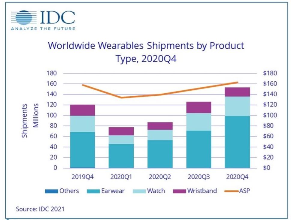 Недавно аналитическая фирма IDC сообщила, что в четвертом квартале 2020 года объем поставок таких устройств и гаджетов достиг 153 миллиона штук, что соответствует росту на 27% в годовом исчислении. За весь 2020 год поставки достигли почти 445 миллионов наименований носимых устройств, что на 28% больше, чем в 2019 году.