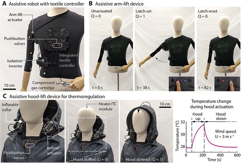 Мы недавно рассказывали о пневматическом "захвате", разработанном исследователями из этого университета. Теперь они создали систему управления для таких носимых устройств, состоящих из трубок, через которые может проходить сжатый воздух, и серии логических вентилей*, аналогичных тем, что используются в компьютерных системах. Эти модули могут управлять прохождением и давлением сжатого воздуха. Такая система позволит человеку направлять энергию в системе в виде сжатого воздуха на различные компоненты носимой системы. В качестве примера исследователи разработали устройство, которое позволит человеку поднимать капюшон куртки одним нажатием кнопки.