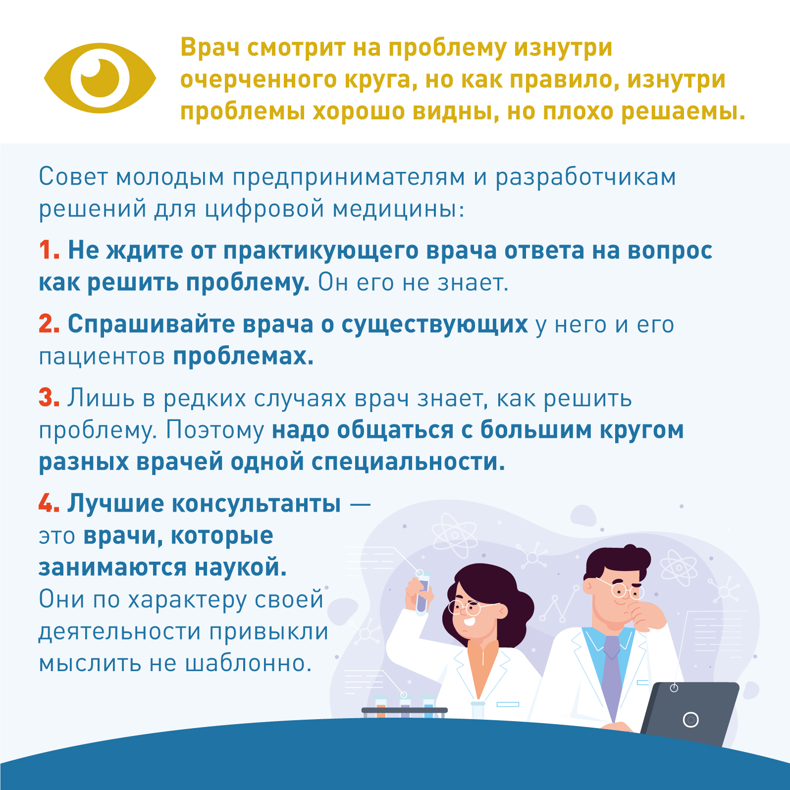 Мне приходится работать и общаться с командами и отдельными специалистами, которые пытаются создавать инновационные решения в сфере цифрой медицины. В такой среде, где нет экспертов из медицинской среды иногда бытует мнение, что, пообщавшись хорошенько с практикующим врачом, можно от него получить рекомендации или даже целые готовые рецепты для создания стартапа. Но в подавляющем большинстве случаев это не так.