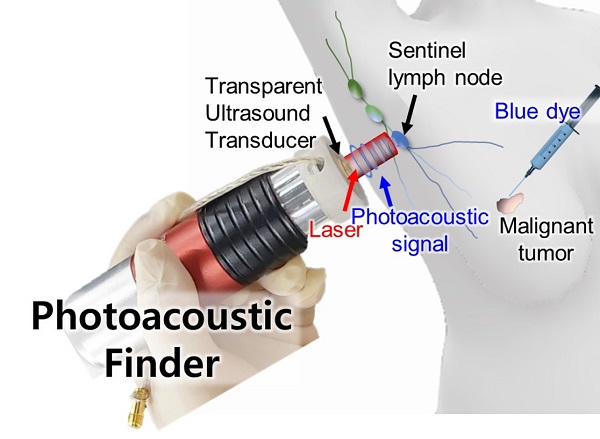 Новая технология, разработанная в университете Пхоханга, не требует облучения и основана на фотоакустическом эффекте. Устройство сочетает в себе прозрачный ультразвуковой датчик и твердотельный лазер на красителях. Он может облучать участок ткани, содержащий цветной краситель, лазером для создания фотоакустического эффекта, ультразвуковые волны от которого регистрируются датчиком. Чтобы обнаружить сторожевой лимфатический узел, пользователь вводит нерадиоактивный краситель вблизи опухоли, а затем использует новое устройство для оценки близлежащих лимфатических узлов.