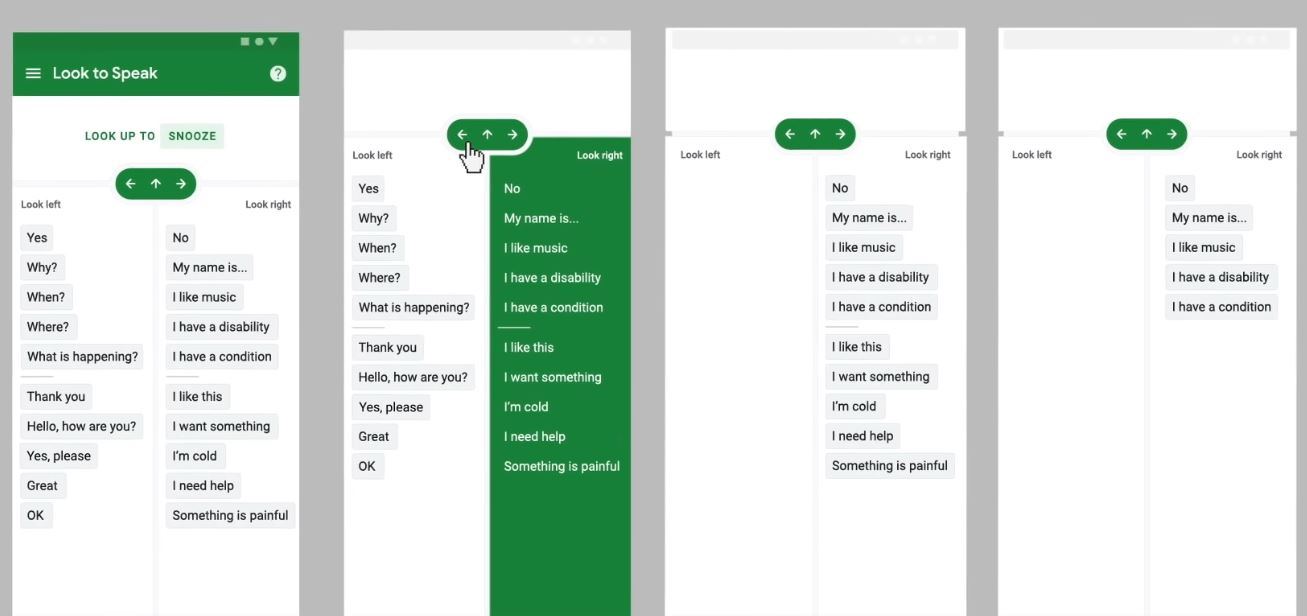 Программа Look to Speak использует технологии машинного обучения и считывания движения глаз, которые позволяют людям с помощью глаз выбирать нужные фразы из списка в своем телефоне, которые затем произносятся вслух. Приложение также можно использовать для того, чтобы отредактировать пользовательский разговорник.