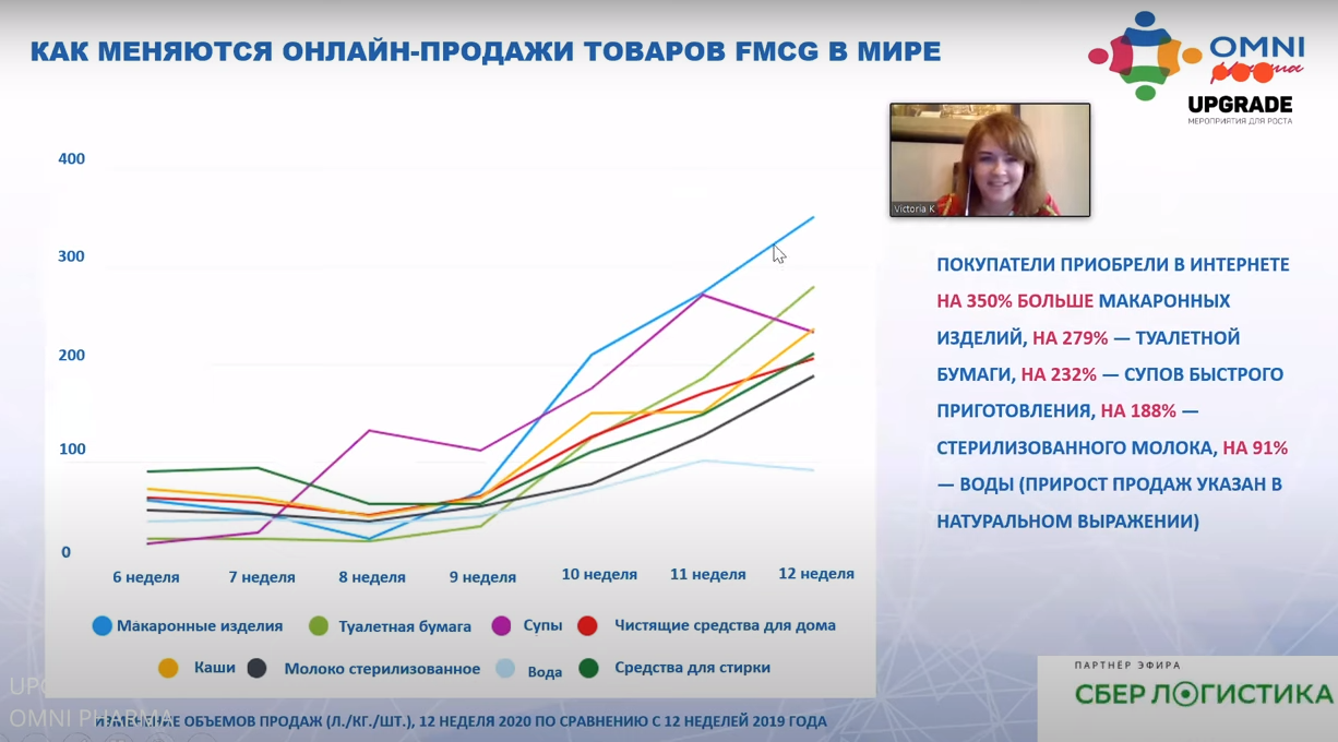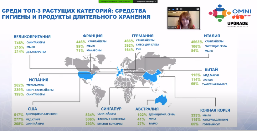 Демонстрируя слайд с информацией о том, как изменился покупательский спрос в мире в период пандемии, эксперт отметила, что во время эпидемии экстремально вырос спрос на различные санитайзеры и дезинфицирующие средства, ставшие самыми ходовыми товарами. Также люди стали чаще покупать термометры. Вкупе с интересом к сухим продуктам питания, можно говорить о радикальном перераспределении интернет-покупок. Например, во всем мире на триста пятьдесят процентов стало больше приобретаться макаронных изделий. Туалетная бумага догоняет по спросу (279%). Также вырос спрос на готовые супы, кашу и молоко. Ситуация быстро изменила ментальность людей, которые стали жить в «режиме запаса продуктов». 56 % людей ожидают ухудшение своего материального положения.