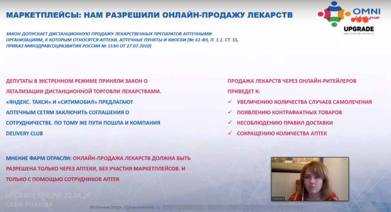 Многие ведущие игроки отрасли отмечают, что сложно запускать онлайн-торговлю лекарствами просто через маркетплейсы со случайно-набранными курьерами без профильного образования, потому что негде взять нужное количество провизоров и фармацевтов, чтобы осуществлять доставку лекарств с их участием, так как кто-то должен консультировать покупателей. Самолечение всегда может обернуться неприятными и даже непоправимыми последствиями.