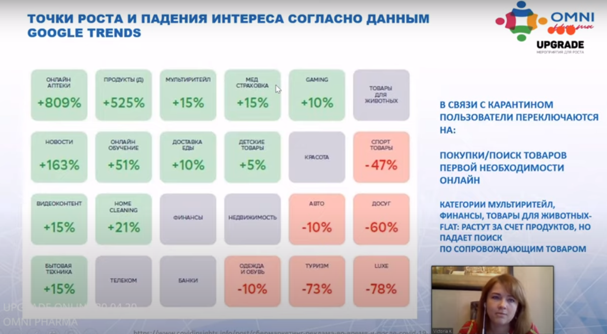 Модератор конференции Виктория Кузнецова, управляющий партнер Центра Бизнес-Технологий, победитель в номинации «Человек года» категории «Аптеки и Розница» премии Digital Health Awards 2019 в рамках своего вступительного слова рассказала о главных трендах рынка Omni Pharma. Ее выступление на тему «Коронамаркетинг 2020: тренды, реалии, прогнозы» стал поводом для всестороннего обсуждения.