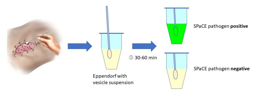 Тестовый раствор содержит небольшие везикулы, в которых заключен флуоресцентный краситель. Когда мазок из раны, инфицированной одной или несколькими бактериями SPaCE, инкубируется в растворе, факторы вирулентности, выделяемые этими бактериями, разрушают везикулы, высвобождая краситель, и изменение цвета можно легко определить с помощью портативного флуориметра.