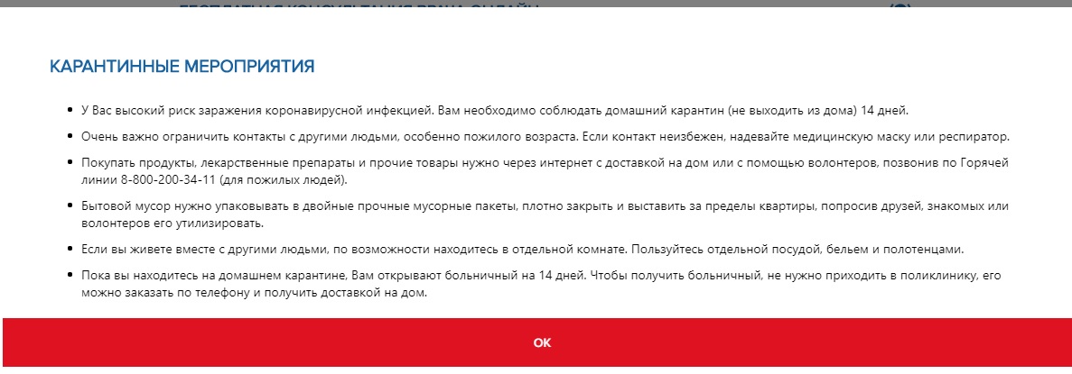 Каждый получает персональные рекомендации по вопросам, как получить бесплатную консультацию врача онлайн, какими должны быть карантинные мероприятия, как осуществлять контроль насыщения крови кислородом, проводить гигиеническую обработку рук. Система выдает советы по соблюдению гигиены лица и видимых слизистых оболочек, подробные инструкции по использованию средств защиты органов дыхания и проведению санитарных мероприятий жилых помещений, особому уходу за пожилым человеком.