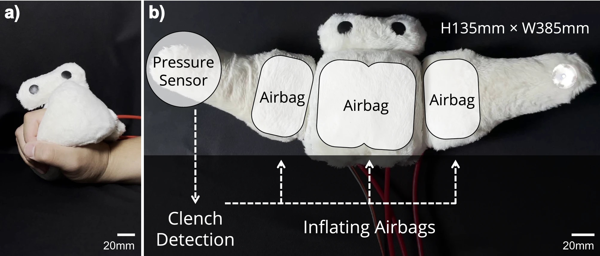 Группа научных сотрудников университета Цукуба в Японии разработала пушистого мягкого робота, с которым пациенты могут взаимодействовать, чтобы уменьшить стресс и страх при прохождении болезненных или неприятных медицинских процедур. Для некоторых пациентов, особенно детей, страх перед иглами или неудобными и болезненными процедурами может сделать их особенно сложными и привести к тому, что они попытаются избежать лечения. Поиск способов успокоить таких пациентов очень важен для того, чтобы уменьшить их страх и позволить им пройти необходимое лечение. Робот имеет надувные исполнительные механизмы, которые могут взаимодействовать с рукой пациента и сжимать ее, имитируя ощущение человеческого прикосновения. Исследователи обнаружили, что робот может отвлекать и оказывать успокаивающее воздействие на пациентов.