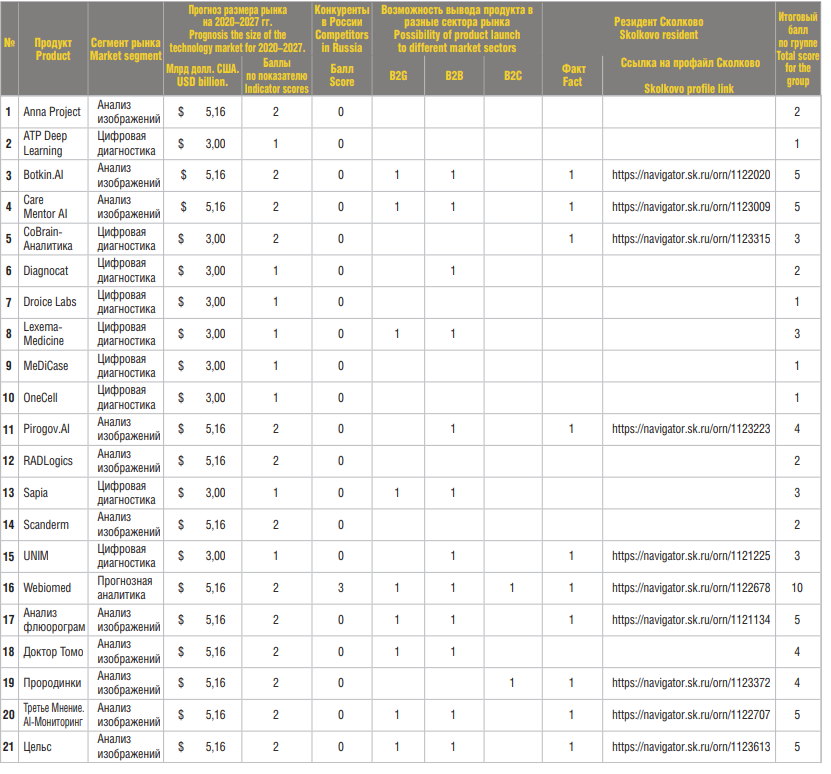 Исходя из проведенной работы авторы исследования изучили 21 значимый ИИ-стартап, способствующий повышению качества работы медицины в целом. Исходя из проведенной оценки описанная продукция компании учтена по 4 основным критериям:
