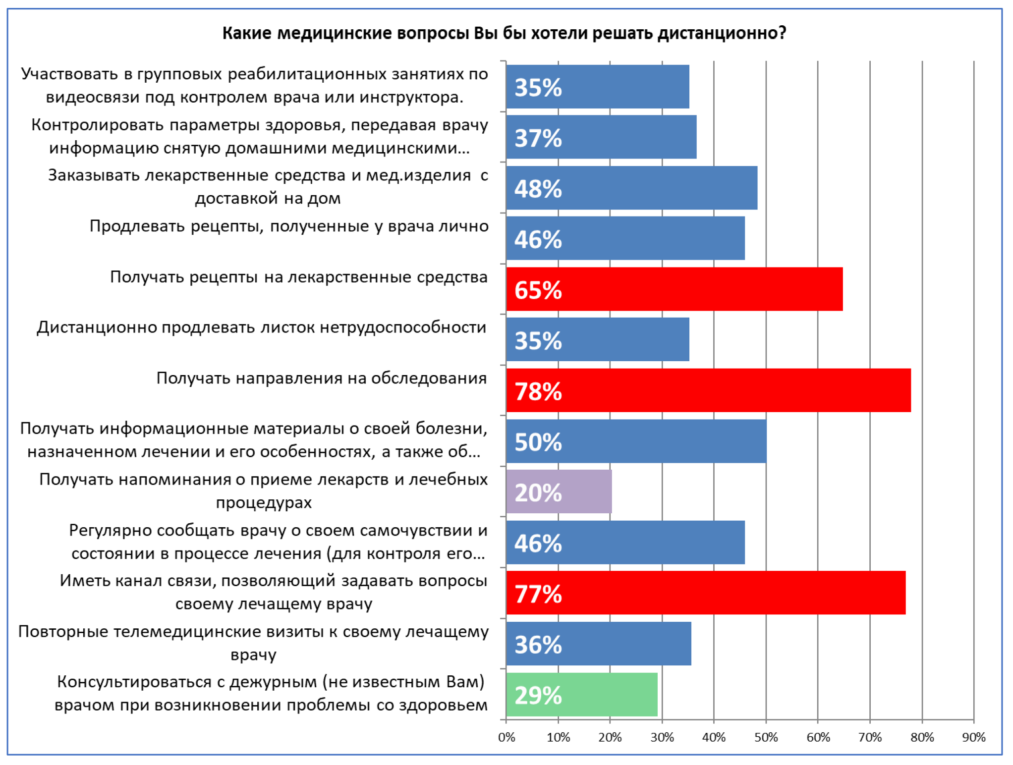 При этом интересно, какие свои проблемы пациенты хотели бы решать дистанционно? Самые востребованные выделены красным. Наименее востребованными (выделены синим цветом) оказались напоминания о приеме лекарств и первичные телемедицинские консультации. Характерно, что именно эти сервисы наиболее широко сейчас представлены среди имеющихся на рынке. Неожиданным оказалось то, что только половина опрошенных хотела бы заказывать лекарства с доставкой на дом. Казалось бы, что это должно быть востребовано практически всеми инвалидами по здоровью (а их в опросе 64%).