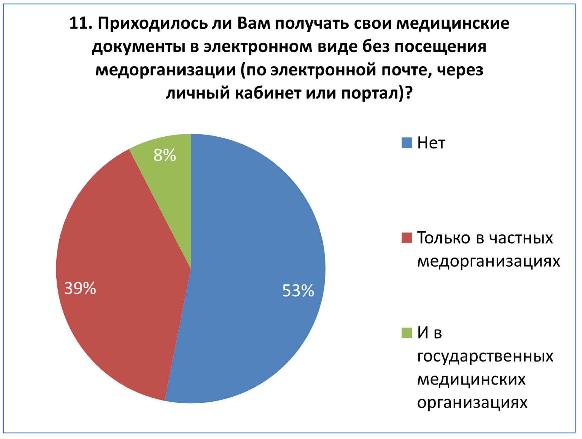 И одной из главных выгод является быстрое и удобное получение своих медицинских документов в электронном виде. И в этом направлении пока явный «провал»! Больше половины хронических пациентов (давно и много болеющих) никогда не получали своих медицинских документов в электронном виде, и только 8% получали их в государственных медорганизациях. С этим надо что-то делать!