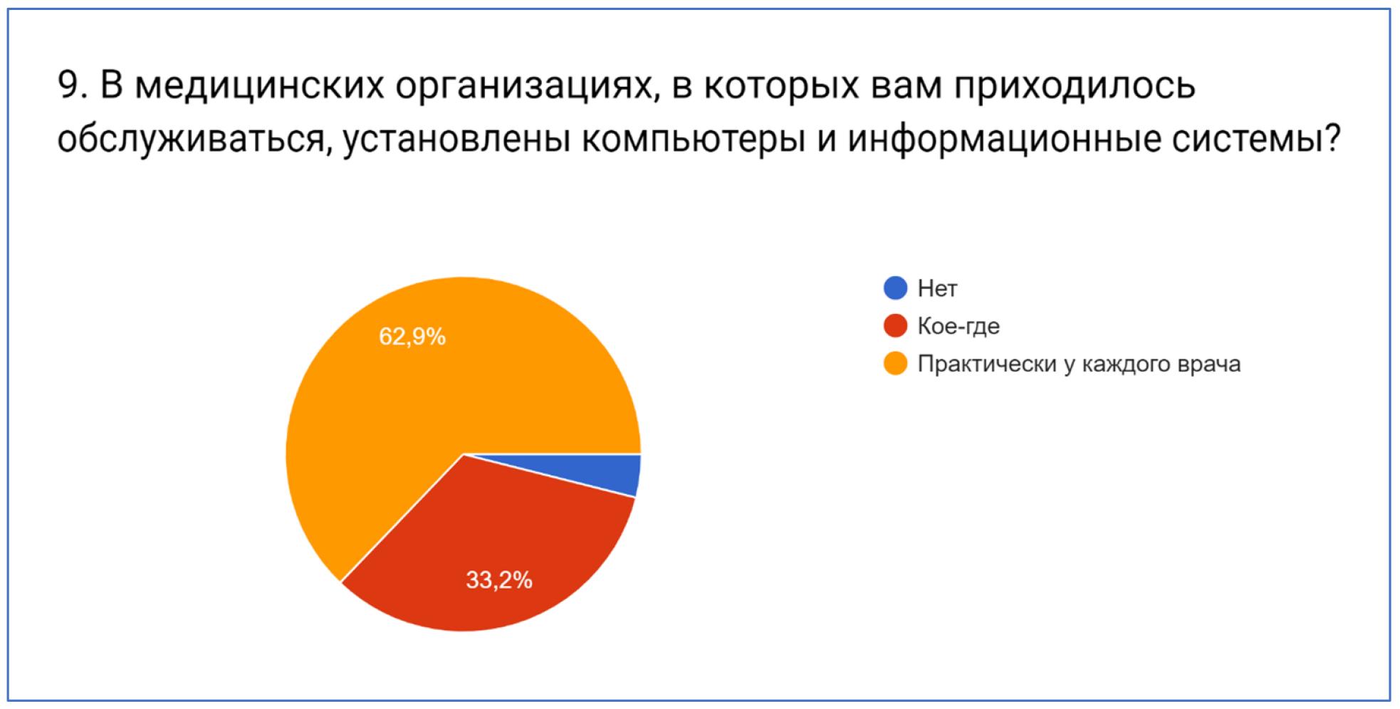 Отдельная часть опроса, касалась отношения пациентского сообщества к цифровизации здравоохранения. Результаты свидетельствуют о том, что пациенты «видят» цифровизацию! Причем 63% видят компьютер почти у каждого врача.
