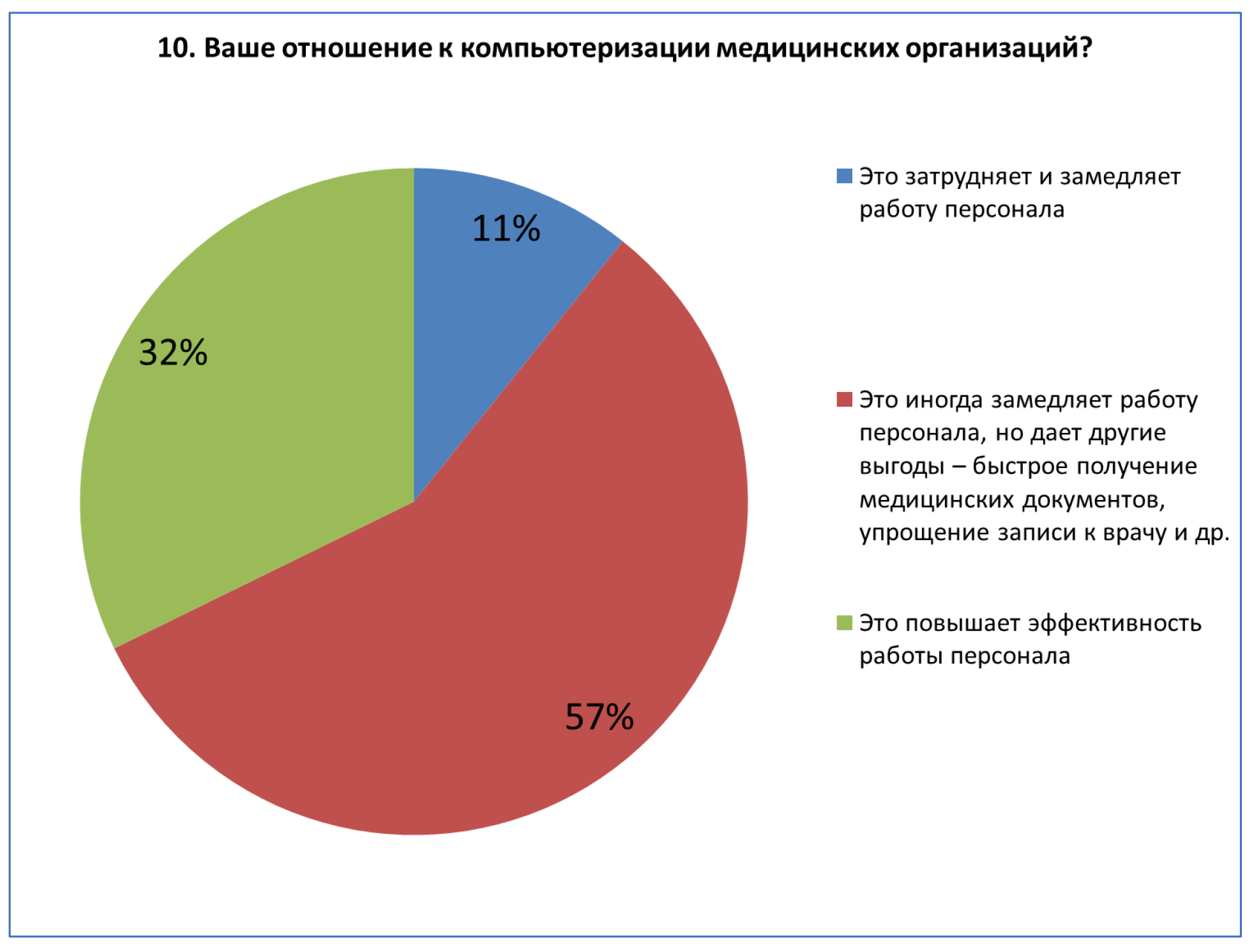 Вопрос об отношении к цифровизации был немного провокационный. Мы хотели оценить тот «вал» негатива, который можно увидеть в соц.сетях по поводу того, что компьютеры затрудняют и замедляют работу врача. Но такого мнения придерживается всего 11%. Зато 57% готовы потерпеть эти небольшие неудобства ради выгод цифровизации!