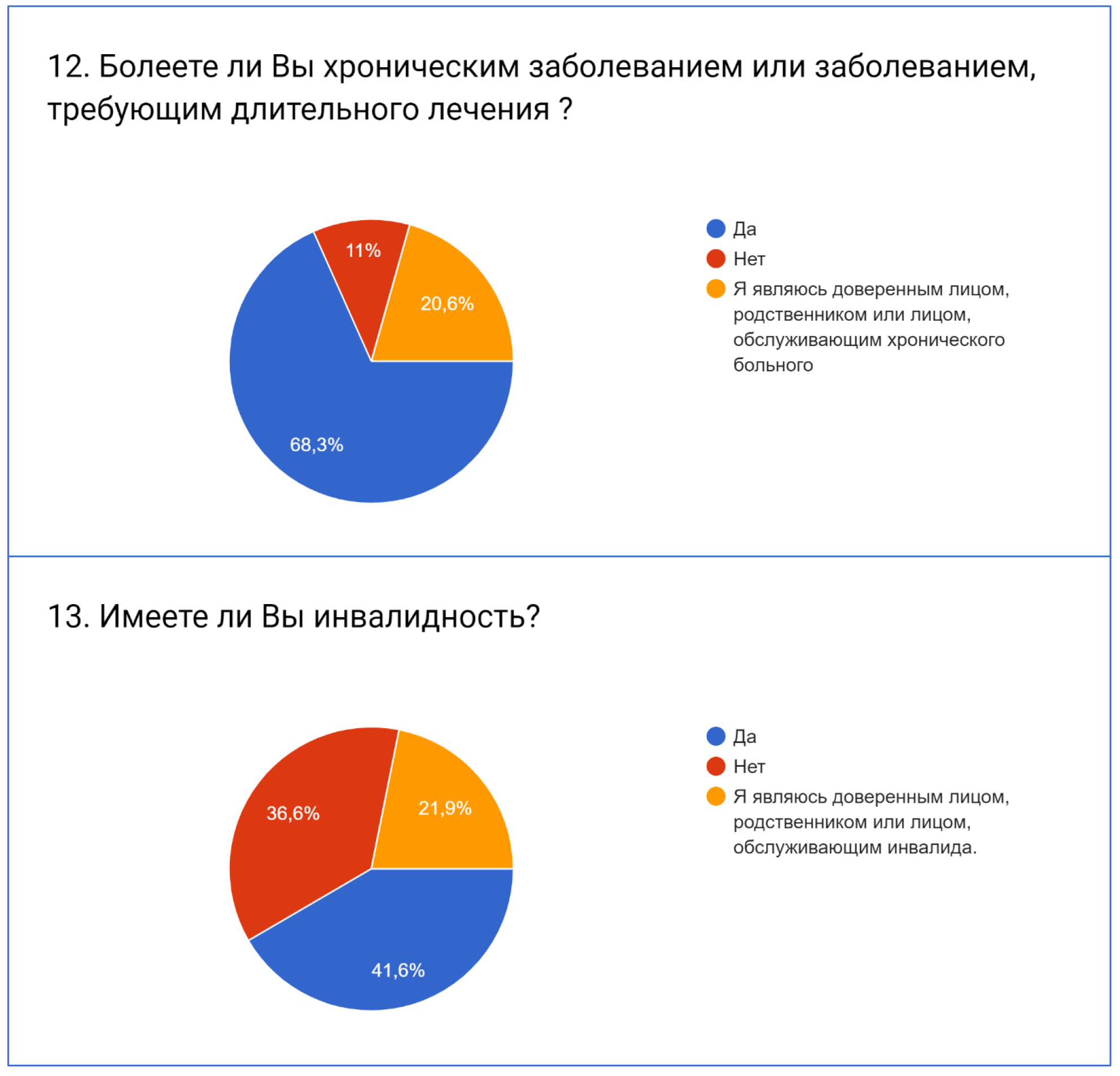 Опрос проводился в сети интернет. Ряду пациентских организаций была отправлена ссылка на опросник, которую они и распространили среди своих членов. В течение ноября 2019 года был получен 281 ответ на вопросы. Проведение опроса через пациентские организации обеспечило смещенную выборку, в которую попали в основном тяжелые хронические пациенты (89%), причем 64% ответивших являются также инвалидами по здоровью.