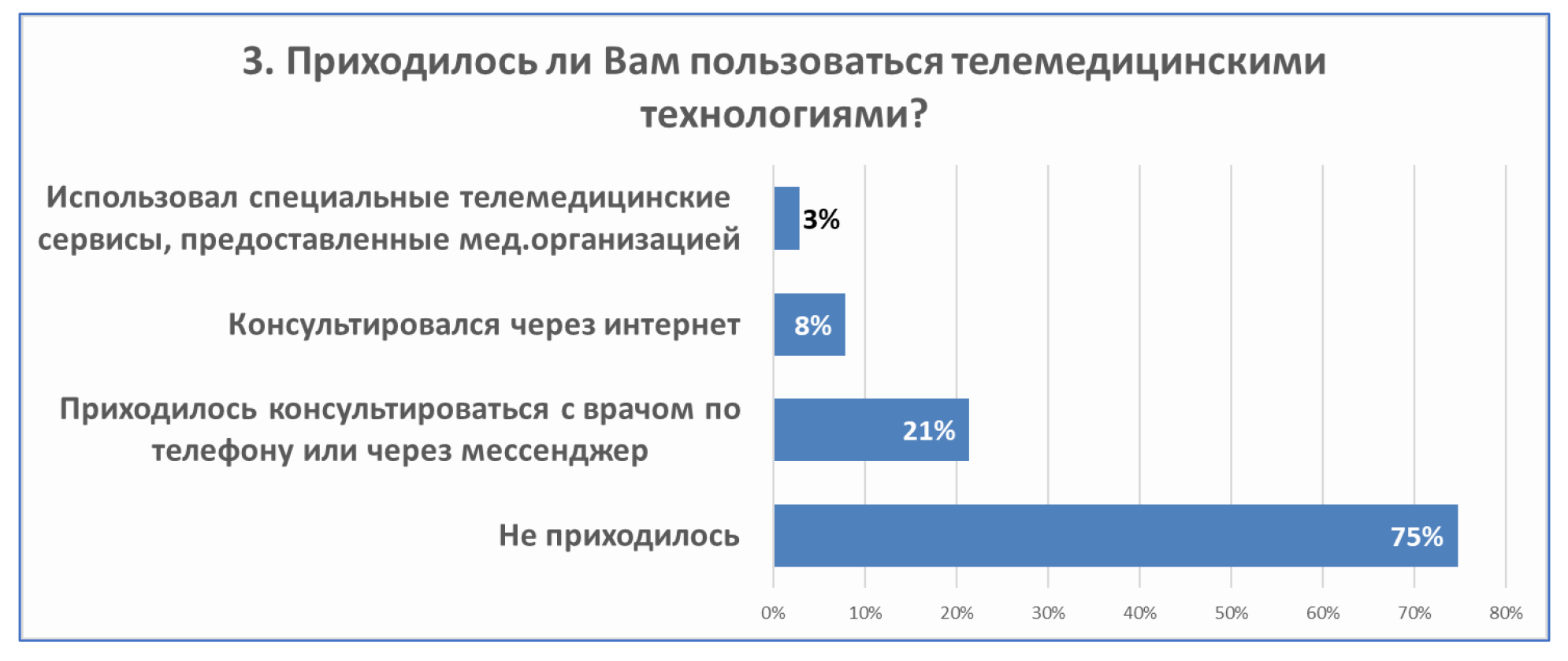 Только 3% пользовались ими через специальные инструменты, предоставленные медицинской организацией. Пока самый «реальный» телемедицинский канал – это консультирование с врачом по телефону или через общедоступные мессенджеры (21%).