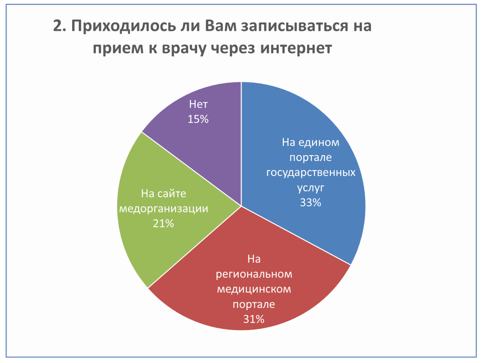 Хорошие результаты дало введение систем записи на прием через интернет - всего 15% опрошенных ими не пользовались (при этом большая их часть сообщила о том, что сервис, который они провали - не работал). 85% пациентов – записывалось на прием через интернет, причем запись на едином портале госуслуг, через региональные системы и через региональные системы использовались относительно равноценно.