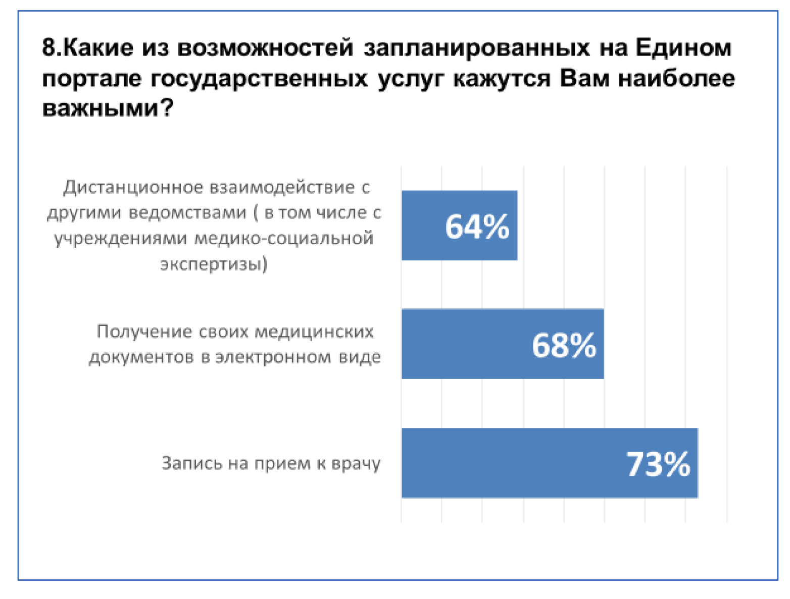 Два вопроса касались того планируемого Минздравом суперсервиса «Мое здоровье». Этот сервис планируется разместить на Едином портале государственных услуг (ЕПГУ). Именно поэтому хотелось оценить уровень использования ЕПГУ пациентским сообществом. Результат оказался достаточно оптимистичным. Хотя только четверть опрошенных использовала ЕПГУ для решения вопросов со здоровьем, но более 70% «знает дорогу» на этот портал и, вероятно, будет пользоваться им, когда там появится широкий спектр решений, связанных со здоровьем.
