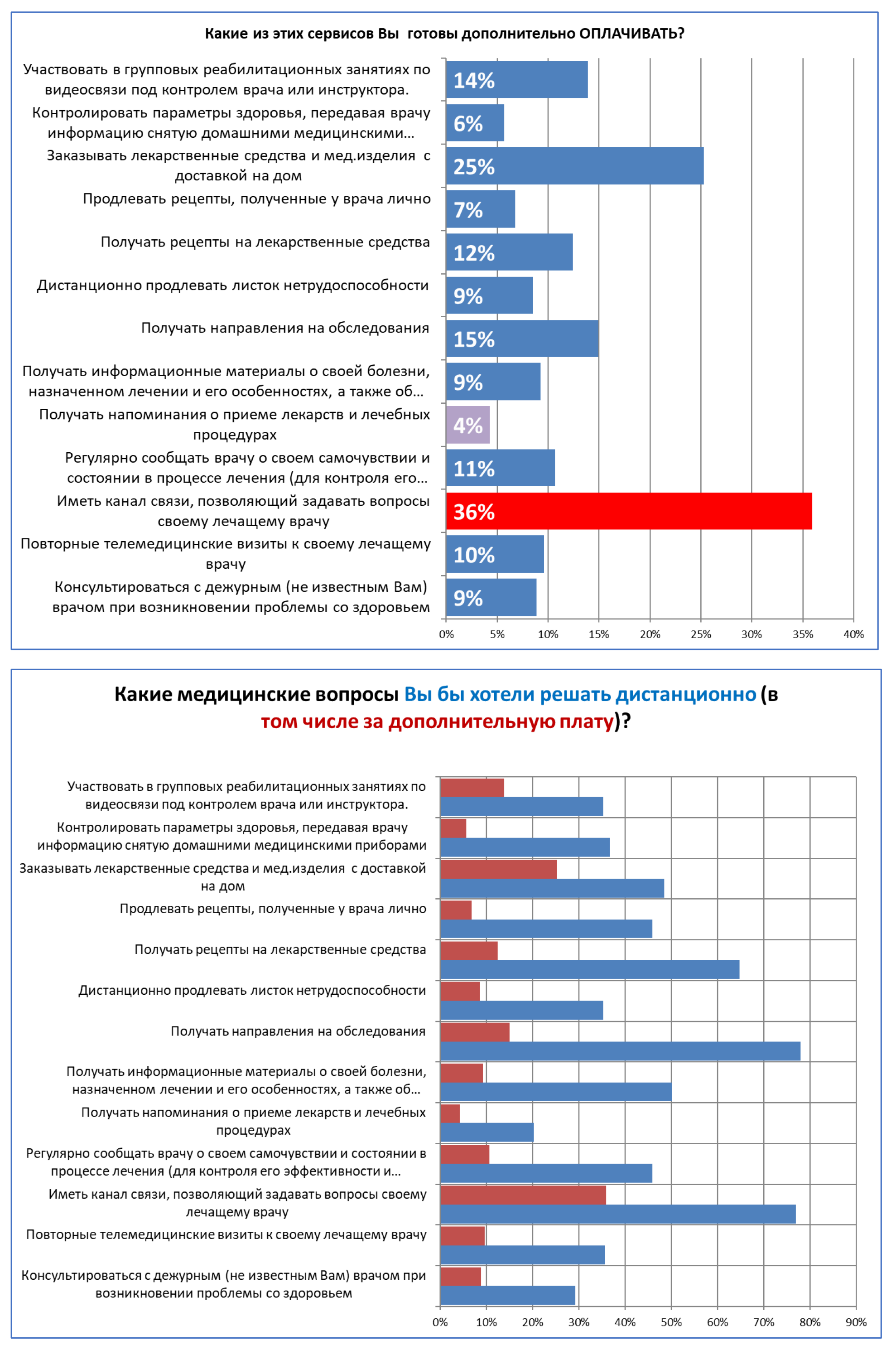 Эти результаты демонстрируют, что пациенты достаточно хорошо понимают (и согласны оплачивать) те услуги, которые требуют дополнительных трудозатрат медицинского персонала. В то же время дистанционное получение и продление рецептов и направлений, которое должно просто стать элементом лучшей организации работы медорганизации, не воспринимается как услуга, требующая оплаты.