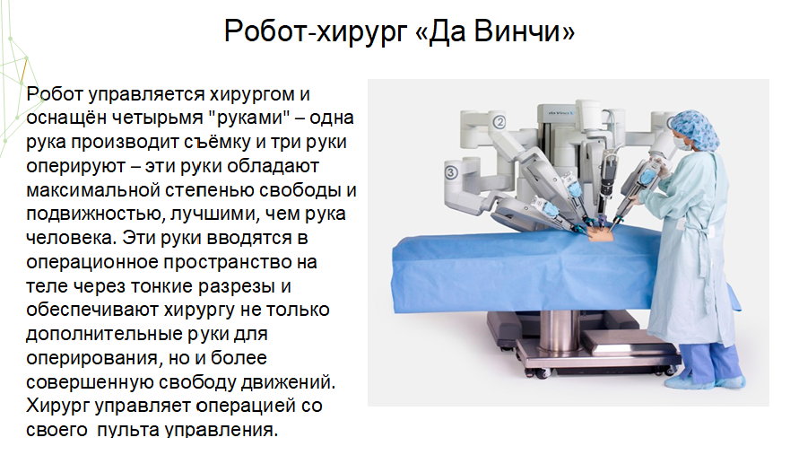 Я встречался с одним хирургом, который работал на «Да Винчи», и он сказал очень запомнившуюся мне фразу: «Кто поработал на «Да Винчи», скальпель больше в руки не возьмет». Дело в том, что в целом смертность после операции с участием такого рода роботов на порядок ниже, чем смертность у среднего хирурга. У робота несколько рук, одна из них оснащена камерой с микроскопом, остальные руки оснащены инструментом.