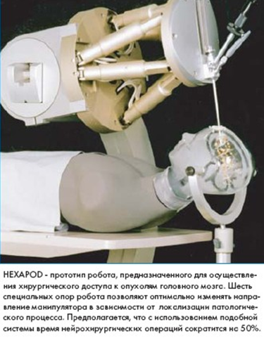 Больше двадцати лет назад начали внедрять робота, который использовался для дистанционной эндоскопии. Уже у него в руках были хирургические инструменты. Еще один «старичок» производил операции на головном мозге и лечение или удаление опухолей головного мозга.