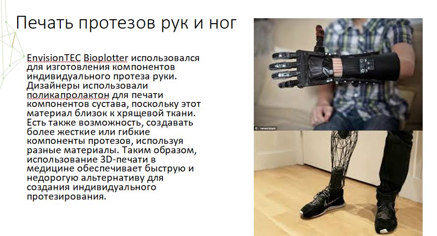 —3D принтеры стоят технически особняком от роботов. Это — соседний технический сегмент, но у них с роботами общая цель — восстановить здоровье людей. 3D принтеры уже зашли в область печатания биологических тканей: каркасы тканей, различные кости, плаценту, волокна и др.