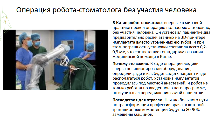 Его заранее обучают, какие он должен движения делать, а он их запоминает. При этом он снабжен дополнительной камерой, которая более точно позиционирует его относительно пациента. И он полностью автономно устанавливает пациентке 2 импланта, причем сами импланты тоже перед этим были распечатаны на 3D принтере. Точность очень высокая и с помощью такого рода инструментов можно увеличить производительность труда в стоматологии.