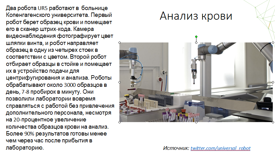 — С помощью роботов можно производить забор и анализ крови. Коллаборативные манипуляторы приспособлены для обработки пробирок. Один берет пробирку, второй сканирует штрих-код, они их раскладывают, перекладывают, закладывают в центрифугу и проводят анализ.