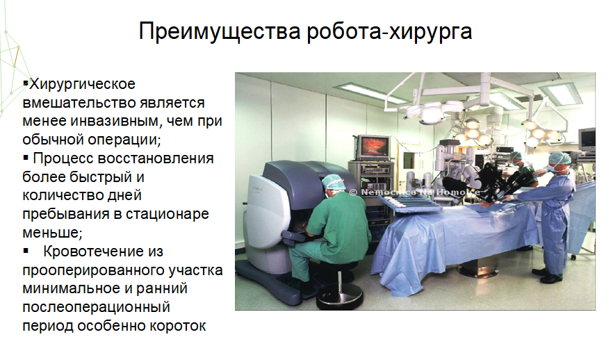 Роботы-хирурги делают более щадящие операции, менее инвазивные, потому что сам протокол намного короче. Это значит, что человек быстрее восстанавливается, меньше находится в больнице.