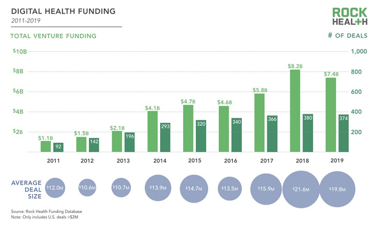 За последнее десятилетие объем ежегодного финансирования сделок в области цифрового здравоохранения в целом рос, однако в 2019 году инвестиции несколько сократились по сравнению с 2018 годом (8,2 млрд долл. США). Это не удивило аналитиков Rock Health, которые предсказали этот поворот событий еще в прошлом году.