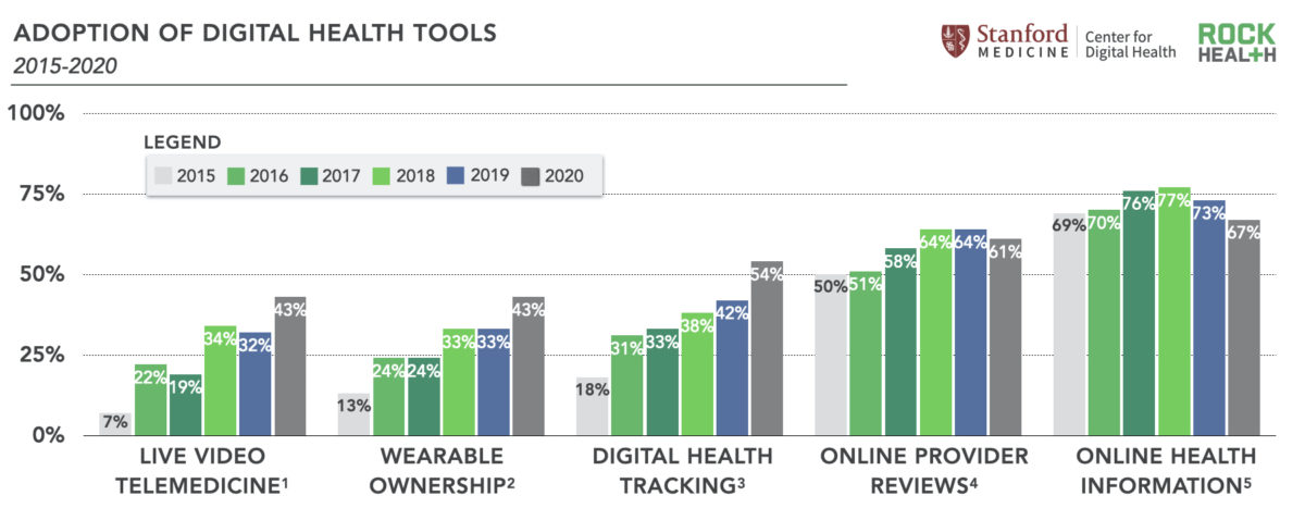 Компания Rock Health и Стэнфордский центр цифрового здравоохранения опубликовали результаты шестого ежегодного опроса по вопросам адаптации потребителями технологий цифрового здравоохранения в США.